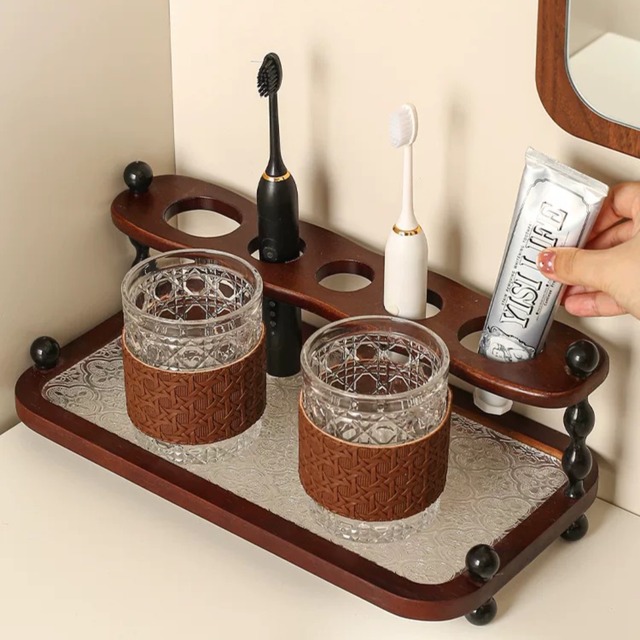 【収納トレイ】 ガラスデザインがおしゃれな歯ブラシスタンド。 水回りがおしゃれにスッキリさせることができます。 トレイ部分はコップを置いたりアクセサリーを置いたり様々な使い方ができます。 【種類】 Type-A・Type-B 【サイズ】 H9.5cm×W28.5cm×D17.5cm ※写真と実物では色の見え方が異なる場合があります、ご了承ください。 ※こちらは受注後の海外発注になるため、約2~4週間お時間がかかりますことを予めご了承のうえ、購入をお願いいたします。